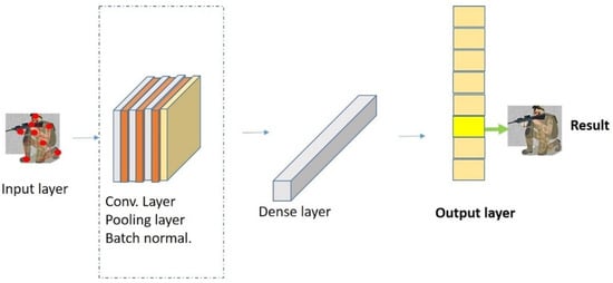 A CNN architecture is utilized to perform the classification of skeleton sequences derived from the output of Stage 3. The design of the CNN classifier is illustrated in Figure 8. Observe that the CNN consists of three convolutional layers, including a batch normalization layer, a max pooling layer, and a dense layer. Afterwards, the classification is performed via a SoftMax function, which yields: