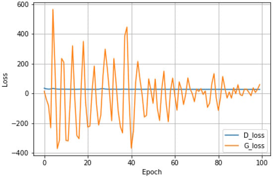 The data from nine different measurements of the sensors (x, y, z gyroscopes, x, y, z accelerometers, x, y, z magnetometers) are preprocessed, normalized, and transferred to quaternion forms. Therefore, the pre-trained data are prepared for the variational autoencoder stage for training. The output of VAE is applied as the input for the GAN stage. After the GAN training, the generated synthetic output is processed via the final stage (i.e., a CNN classifier). The generator and discriminator are trained with the Adam optimizer with a learning rate of 1 × 10−5. A batch size of 100 is used for the GAN architecture, where the generator loss and discriminator loss converge to 59.92 and 27.68 after 100 training batches, respectively. The best generative loss is 4.41 for epoch 91. The result of generator and discriminator losses are depicted in Figure 9.