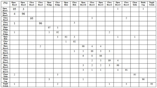 To validate the classification performance, we evaluate the confusion matrix result on the UCI OPPORTUNITY dataset. As depicted in Figure 10, the accuracy of all activities trained by all sensors data ranges from 86% to 97%. Although the accuracy of open drawer, close drawer cases have lower classification results, the proposed method is able to benefit from the DNN model to improve the accuracy of most classification results. We also evaluate mutual action classification results.