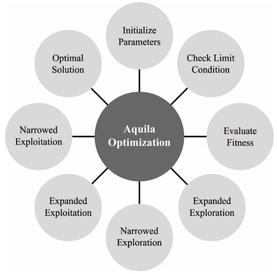 Abualigah et al. [19] introduced the fundamental formula of the Aquila optimizer (AO). Usually, the AO algorithm mimics the natural behavior of Aquila for catching the prey. Like other metaheuristic (MH) models, AO was a population-based optimization algorithm that takes place by creating an early population that has agents. In Equation (6), the mathematical modeling of the algorithm is given.