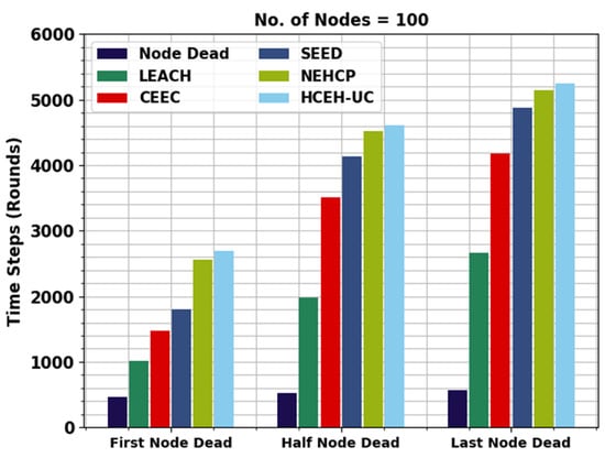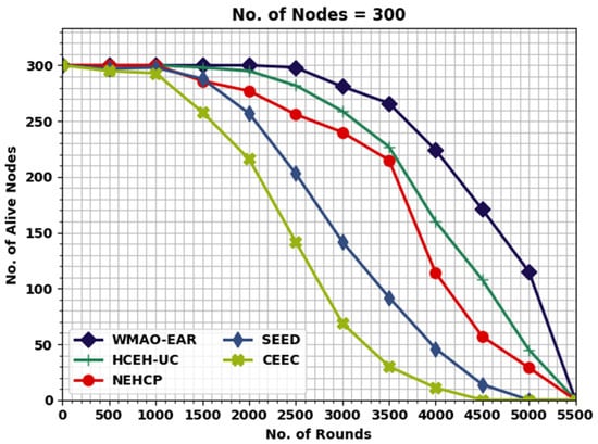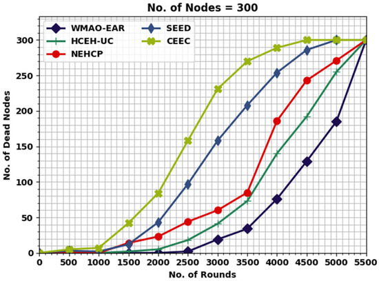 Figure 4 displays the detailed lifetime assessment of the WMAO-EAR approach under NC of 300. The results denote the WMAO-EAR method obtained an extended lifetime. For example, in terms of FND, the WMAO-EAR approach has rendered an increased FND of 2786 rounds, whereas the LEACH, CE-EC, SEED, NEH-CP, and HCEHUC approaches attained reduced FND of 528, 1091, 1610, 1814, and 2651 rounds, respectively. For HND, the WMAO-EAR method and HCEHUC models reached reduced HND of 616, 2088, 3566, 4221, and 4562 rounds, respectively. Finally, in terms of LND, the WMAO-EAR approach gave an increased LND of 5387 rounds, where the LEACH, CE-EC, SEED, NEH-CP, and HCEHUC methods reached reduced LND of 715, 2736, 5072, 4327, and 5017 rounds, respectively.