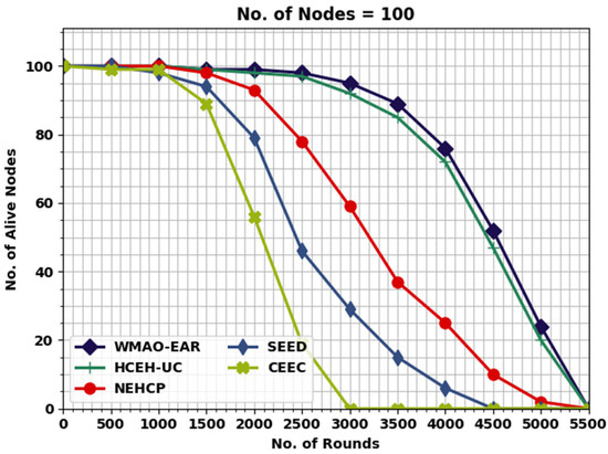 This section inspects the routing performance of the WMAO-EAR method on WSNs. The presented WMAO-EAR model is tested under two node counts (NC) of 100 and 300. Table 1 provides a lifetime inspection of the WMAO-EAR model with existing methods in terms of FND, HND, and LND [24]. Figure 3 exhibits a brief lifetime assessment of the WMAO-EAR method under NC of 100. The results implied that the WMAO-EAR model attained an extended lifetime. For example, concerning FND, the WMAO-EAR model offered an increased FND of 1500 rounds, whereas the LEACH, CE-EC, SEED, NEH-CP, and HCEHUC models reached reduced FND of 466, 1000, 990, 780, and 2563 rounds, respectively. In terms of HND, the WMAO-EAR technique presented an increased HND of 4750 rounds, whereas the LEACH, CE-EC, SEED, NEH-CP, and HCEHUC techniques reached a reduced HND of 531, 4328, 3269, 2251, and 4525 rounds, respectively. Finally, in terms of LND, the WMAO-EAR algorithm provided an increased LND of 5432 rounds, while the LEACH, CE-EC, SEED, NEH-CP, and HCEHUC techniques achieved reduced LND of 275, 5230, 5072, 4500, and 5140 rounds, respectively.