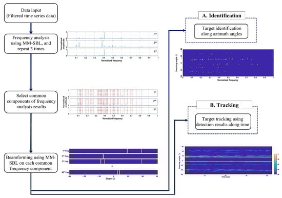 Figure 2 presents a flowchart of target identification and tracking using MM-SBL. We considered input data to be the filtered time-domain signals measured by the sensor array of the passive sonar system. As previously mentioned, because passive sonar systems consist of multiple sensors, we considered temporal (multiple time snapshots) and spatial (multiple sensors) multiple measurements in frequency analysis. An SBL using multiple measurements improves the detection performance and robustness of the SBL against noise by emphasizing the commonality of the signals contained in the data. Therefore, frequency analysis using the MM-SBL leads to consistent frequency estimates by diminishing the random noise components. We detect the frequency components of the target signals in the data through a frequency analysis using MM-SBL. This study aimed to detect continuously occurring tonal frequency components in the underwater targets. Therefore, to detect the frequency components of the target signals more accurately, we performed a frequency analysis three times, where each frequency analysis used one second shifted signal over time. Then, we select components that exactly match in each frequency analysis result as the common frequency components. Although, this method could lead to the loss of some of the tonal frequency components of the target signals; however, it shows that it has sufficient detection performance (shown in Section 5).