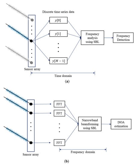 As shown in Figure 3, frequency analysis is performed using the filtered discrete time series data as input and DOA estimation is performed at a specific frequency (narrowband beamforming) using the frequency domain data converted from the time-domain signals by FFT after being received by the sensor array. That is, frequency analysis and the DOA estimation were performed using inputs in different domains.