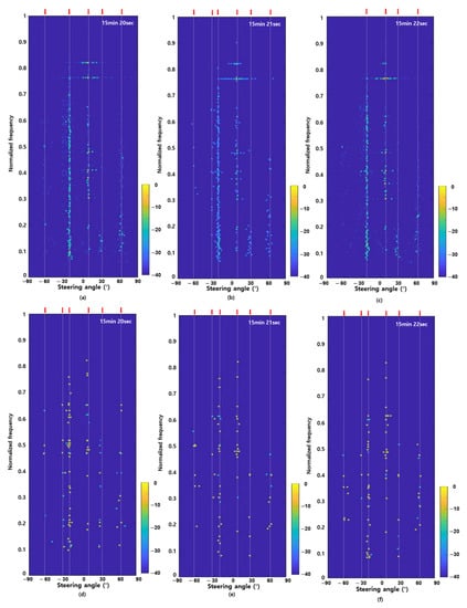 Frequency-azimuth plots using (a–c) conventional detection method with detection threshold; (d–f) proposed detection method using the MM-SBL at the 15 min 20 s to 22 s.