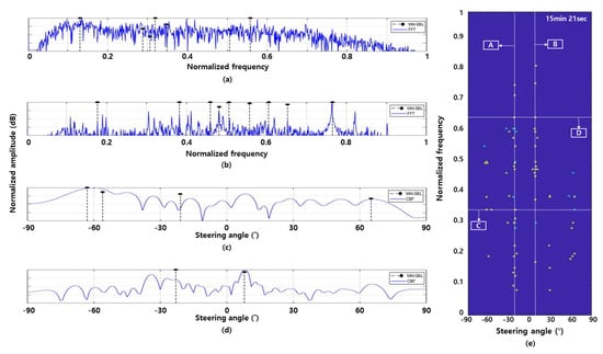 Figure 7e shows a FRAZ plot of the proposed detection method using the MM-SBL at 15 min 21 s. ‘A’ and ‘B’ in Figure 7e mean frequency lines at steering angle −20° and 9°, respectively. ‘C’ and ‘D’ in Figure 7e indicate azimuth lines at the normalized frequency components of 0.349 and 0.653, respectively.