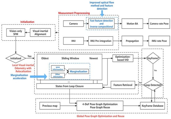 Figure 1. VINS-MONO process structure diagram. The blue dotted box and blue font are the improvements of VINS-MONO algorithm in this paper.