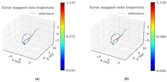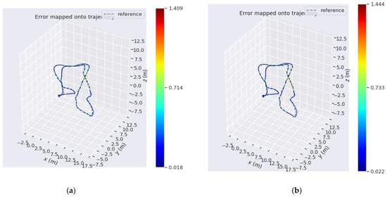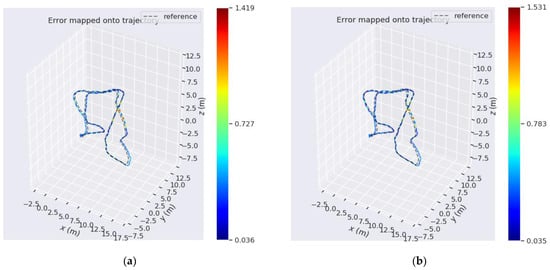 Figure 5. (a) is the trajectory error of VINS-MONO algorithm on sequence_03.bag dataset. (b) is the trajectory error of the optimized VINS-MONO on Sequence_03.bag dataset.