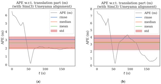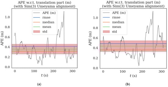 Figure 7. (a) is the Absolute Pose Error (APE) of the improved algorithm and (b) is the Absolute Pose Error (APE) of the original algorithm. The black line is the absolute pose error (APE), the blue line is the root mean square error (RMSE), the orange line is the median error (median), the green line is the mean error (mean), and the red area is the standard deviation (std).