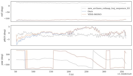 The two algorithms were run on sequence_03.bag datasets provided in HAUD-Dataset, and RMSE, rotation error and translation error were used to compare the accuracy of the optimized VINS-MONO algorithm and VINS-MONO algorithm, as shown in Figure 7, Figure 8 and Figure 9.