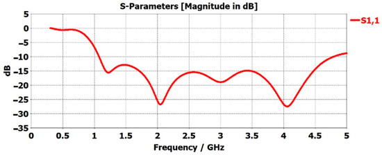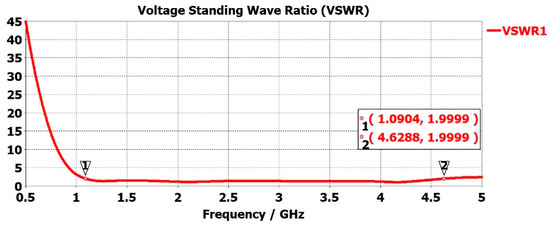 To deliver maximum power to the antenna, impedance matching needs to be conducted accurately. The Voltage Standing Wave Ratio (VSWR) is the measure of how well antenna impedance is matched. Low VSWR values mean the antenna is receiving maximum power and is well matched, but not all the power needs to be radiated. An antenna is defined as well matched when the VSWR value is below 2 [61,62,63]. Higher VSWR results in the reflection of more power at the antenna and, therefore, non-transmission. A large amount of reflected power at the antenna can damage the system. Figure 6 represents the VSWR of the sensor with the red curve. The VSWR was <2 for 1.0904 GHz < f < 4.6282 GHz.