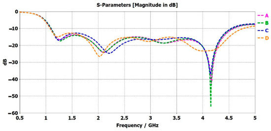 S-parameter (S11) in the model for the unobtrusive sensor (A) on side of the table (B), on the wall to the right (C), above the bed, and (D) to the left of the bed.