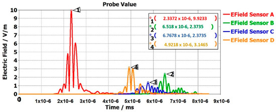 From the electrical signal of the antenna, the antenna performance and the general position of the patient can be known. An electrical field probe was placed at the head of the patient in the model to detect whether the electrical signal reached the probe and the time taken by the electrical signals from the antenna to the probe. Figure 9 shows that all the sensor’s electrical signals experienced different intensities and time delays based on their location. The sensor placed at position A took the shortest time, 2.33272 × 106 ms to reach the probe of all the sensors. Sensor A was the closest to the human model; hence, it displayed the highest electric-field peak value, of 9.9233. This shows the sensors were working accurately. According to the CST model in Figure 7, if the patient moved closer to a other sensor, the highest electric-field value was achieved at that sensor. Therefore, the general location of the patient can be known if only the electric-field graph is studied with the knowledge of the sensor’s location.
