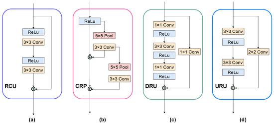 Residual Units The residual learning can effectively prevent the degradation of the model and resolve the gradient vanishing issue during back-propagation. The structure of residual units is shown in Figure 4. The Residual Convolutional Unit (RCU) and the Chained Residual Pooling (CRP) are utilized in the Agent and Context modules, which are the sub-components of RefineNet [45], whereas the Downsample Residual Unit (DRU) [18] and Upsample Residual Unit (URU) [44] are applied for the encoder and decoder, respectively. It is worth mentioning that, while the displayed Chained Residual Pooling (CRP) has two blocks in Figure 4b, we only utilize one block in our subsequent modules since one is sufficient for refinement.