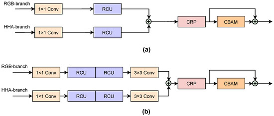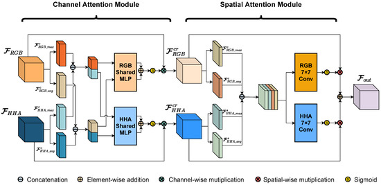 where denotes the sigmoid function and denotes the concatenation. It is worth mentioning that, different from the CBAM, both MLP have weights of and ; r is the reduction ratio. Furthermore, and represent the RGB descriptors, and represent the HHA descriptors, and and represent the cross-modality descriptors.