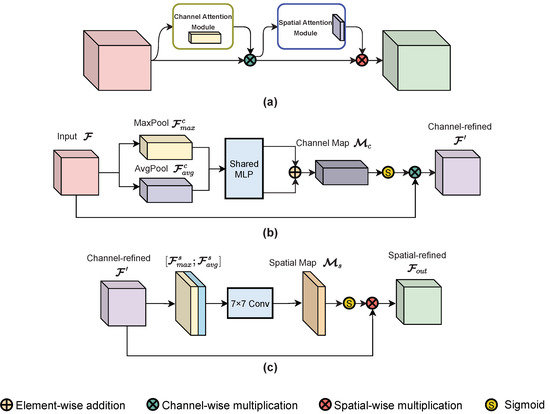 where and represent the input feature maps, and represent the channel-attention maps, and represent the spatial-attention maps, and represent the channel-refined feature maps, and represent the spatial-refined feature maps, and ⊗ denotes element-wise multiplication. In the multiplication procedure, the attention values are broadcast the same as in the implementation in CBAM.