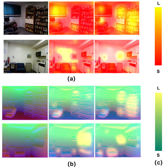 Visualization of channel attention. (a) The visual results on RGB channel-refined features; (b) the visual results on HHA channel-refined features; (c) the color bar.