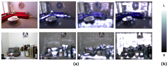 Semantic segmentation is one of the essential techniques in scene understanding technologies. It aims to categorize each pixel and assists in the identification and segmentation of scene elements. Initially, the segmentation can be achieved by handcrafted features and machine-learning algorithms [1,2,3], among which, deep learning is the trend of current research [4,5,6,7]. For semantic-segmentation tasks, it is fully recognized that indoor scenes exhibit distinct aspects compared with outdoor scenarios. For instance, services relying on indoor-scene semantic segmentation (indoor navigation, intelligent furniture, etc.) are strongly demanded by individuals. Therefore, facing the aforementioned challenges, some works apply notable features of the images to assist the segmentation, e.g., edges information [8,9]. Additionally, the illumination variations, overlaps among objects, and the imbalanced representations of object categories in indoor scenes always make it impossible to distinguish numerous objects using solely RGB images [10].