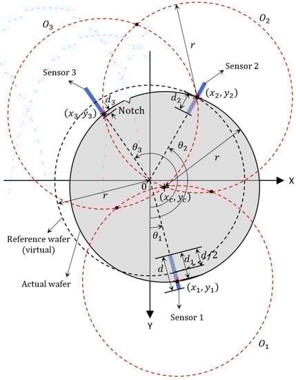 Now we consider the case of three sensors, and then its configuration with the installed sensors is shown in Figure 3. It is supposed that the measurable sensor range d is known. Additionally, the angles of installed sensors , and with respect to the Y-axis are known distinct positive number and it is assumed that . In order to obtain the actual wafer center , we assume the followings.