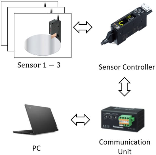 Here, the proposed wafer alignment algorithm is implemented for an actual 300 mm coater/developer system in semiconductor processing for verifying the performance of the method as shown in Figure 4. For this, the thru-beam type digital displacement sensors and controllers (HG-T series manufactured by Panasonic Industry Company) are used in the experiment. To transmit the sensor data to the PC, RS-485 communication is used. The measurable sensor range is d = 5 mm and the angles of installed sensors are , and . It is noted that the parameter , and satisfies Assumption 3.