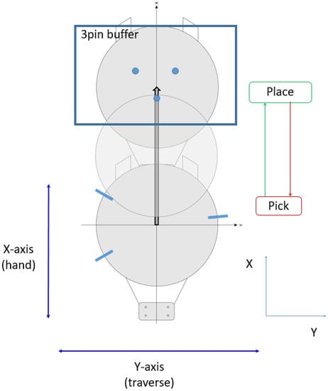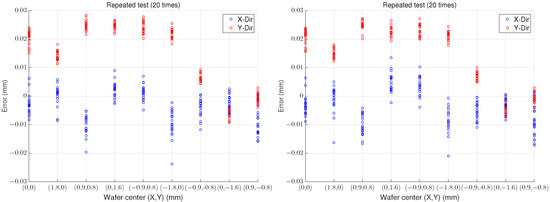 As shown in Figure 6, through the pick and place operation, the robot transfers the wafer to the desired position. The X-axis is capable of high-precision motion with short strokes, while the Y-axis is the traverse direction that moves the robot body, and, thus, the motion precision of the Y-axis is relatively low. Therefore, although the required specifications are satisfied, the error in the Y-direction is larger than that in the X-direction.
