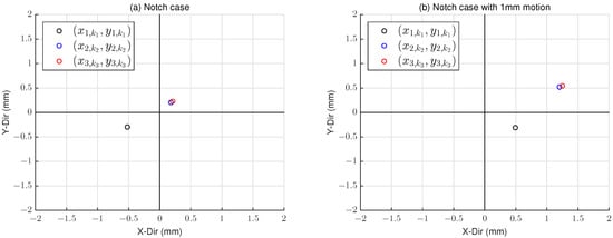 Experimental results of notch case (a) and after 1 mm motion in the X-direction (b).