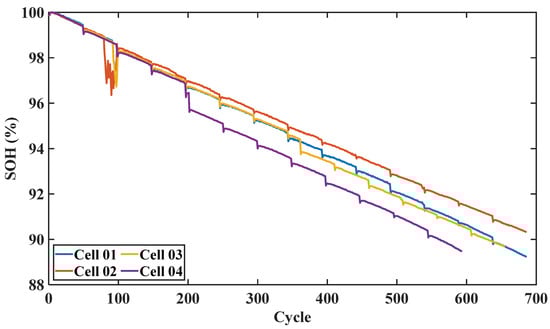 In recent years, to alleviate energy consumption, environmental pollution, global warming, and other issues, multinational governments have vigorously developed electric vehicles (EVs) to build a clean, economic, efficient, and environmentally friendly society [1,2,3]. With the continuous improvement of technology, EVs have gained stronger performances and service lives and have gained more and more recognition from consumers. However, the high power consumption of medium and large EVs is not conducive to the realization of energy conservation and emission reduction goals. In addition to the design, manufacturing, and process of battery, a battery management system (BMS) can be used to control the charging and discharging process of power batteries; this is an easy way to reduce power consumption [4]. With the use of a power battery, its capacity and power will inevitably decline. Therefore, accurate prediction of the state of health (SOH) is an important function of the BMS that can provide a reference for battery control strategies [5].