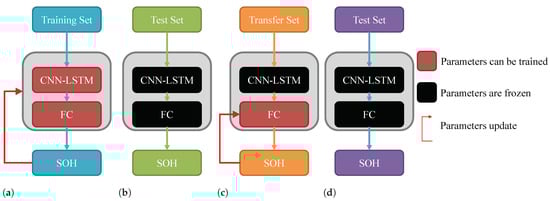 The source task of this paper is the SOH prediction for ten batteries, and the target task is the SOH prediction of the remaining two batteries. The data of the source task are used as the training set to train and update the parameters of the SOH prediction model, as shown in Figure 9a. Without using transfer learning, the target task data are used as the test set, and the SOH prediction results of the target task are obtained by freezing the trained model parameters, as shown in Figure 9b. When using transfer learning, a small amount of data at the beginning of the battery life cycle of the target task need to be taken as the transfer set. The CNN-LSTM layer is frozen and the transfer set is used to train and update the parameters of FC, which is also called fine-tuning, as shown in Figure 9c. The remaining data of the target task are used as a new test set. The test process is shown in Figure 9d.