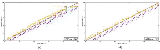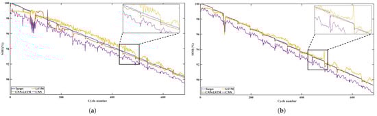 Figure 10 shows the prediction results of two test batteries. It can be seen that although LSTM with battery charging time as its input feature can follow the trend of SOH decline, the prediction results are not stable enough and show obvious fluctuations. Especially at the beginning of the battery life cycle, the prediction results of the single input LSTM differ greatly from the target SOH. This is because, in the experiment, the charging and discharging rates of different batteries are different. When the working environment of the battery changes, the charging time of the fixed voltage segment is also affected by the charging rate. At the same time, the aging factors of the battery are diverse. Although the correlation between the charging time of the fixed voltage segment and SOH is strong, LSTM with the battery charging time as the input feature has a poor prediction effect. The fluctuation of the prediction results of the single CNN model is smaller than that of the single LSTM model. However, because the working conditions of the batteries in the training set and the batteries in the test set are different, there is a large deviation in all prediction results. When the fusion model is used for SOH prediction, the battery cycle features automatically extracted by CNN can closely follow the declining trend of SOH after passing through LSTM with the same structure.