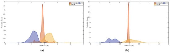 The probability density diagrams of the errors of the different methods are shown in Figure 11. From the diagrams of the two batteries, it can be seen that the error distributions of LSTM model with charging time as the input feature and single CNN model are relatively dispersed, while the error distribution of CNN-LSTM fusion model is relatively concentrated. The position of the centralized trend of the three methods cannot be determined, and there is a certain deviation from the zero error position. Specifically, the position of the centralized trend of the CNN-LSTM fusion model is relatively closer to the zero point.