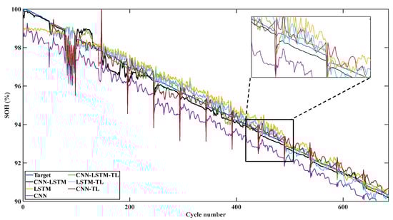From the experimental results, it can be seen that directly using the pre-trained model to test the target battery can also obtain results that meet the battery recession trend. However, there is an offset between the test results obtained in this manner and the actual target value. This is because the pre-trained model can obtain the cycle features and aging features of the target battery, but when mapping the battery features to the predicted SOH value, the full connection layer used is prone to overfitting. Therefore, the transfer learning method is used to tune the pre-trained model with the first 50 cycles of the test battery, and the prediction effect of three methods has been improved to a certain extent, as shown in Table 3. Among them, CNN has the greatest improvement effect, which also reflects the disadvantage of insufficient robustness of the method without transfer learning.