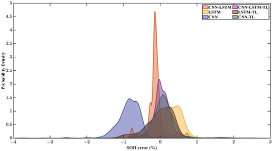 The probability density diagram of the errors after transfer learning is shown in Figure 13. After transfer learning, the error of CNN-LSTM becomes more dispersed but still more concentrated than that of LSTM with single charging time input. The error distribution of LSTM with single charging time input is basically unchanged. However, the location of the concentration trend of the three methods is close to zero-error position, and the prediction results are better.