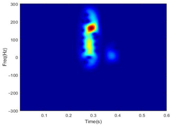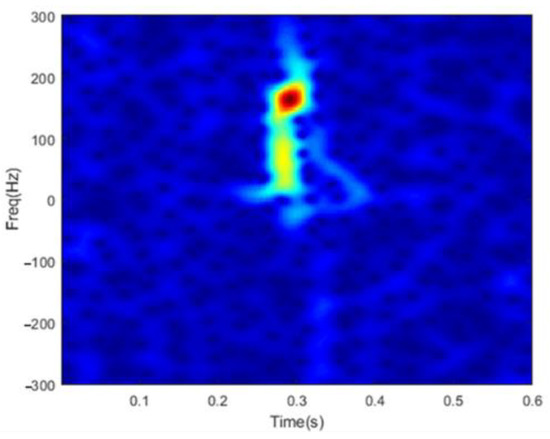The time-frequency distribution of the reconstructed radar echo is shown in Figure 2, with set to be 24. Compared with the raw spectrogram in Figure 1, it is obvious that the position and strength of the dominant time-frequency components are well preserved and highlighted. However, the noises are not removed perfectly. The reason is that the complete sparsity assumption is valid not only for time-frequency signatures of the hand gesture, but also for the noise components. Therefore, it is unavoidable that part of the noise components would be recovered as well in the reconstructed spectrogram.