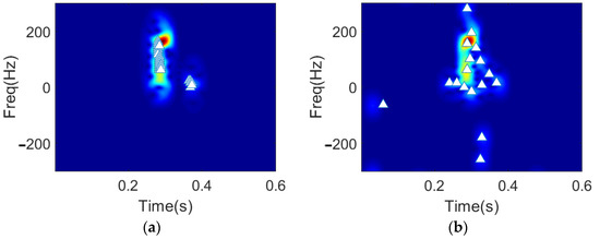 The recognition performance of the proposed approach is given in this subsection, in comparison with the OMP-based method [27]. To give a more intuitively illustration, the reconstructed spectrograms of the snapping fingers under different sparsity levels using the DGS-SP approach and the OMP approach are first shown in Figure 11 with the selected feature vectors’ coordinates highlighted using white triangles in the spectrograms.