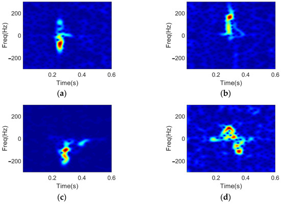 In the experiment, we use only one tranceiving antenna pair to collect the scattered data. The data acquisition setup and the schematic diagrams of four dynamic hand gestures are illustrated in Figure 6. The radar system operates at 24 GHz with a sampling frequency of 1 kHz. The separation between the antenna front and the human hand is about 0.3 m. In total, four types of hand gestures are considered, including (a) snapping fingers, (b) flipping fingers, (c) clenching hand, and (d) clicking fingers. Four human subjects were recruited to conduct the experiment. Each of them repeated the four gestures for 25 times. The duration of radar recording lasts for 15 s. Thus, a complete dynamic hand gesture cycle is about 0.6 s. In this way, we can obtain 400 records of four hand gestures, 100 for each. Then we use the same parameters as introduced in Section 2.1 to calculate the spectrograms of the four types of dynamic hand gestures, and the results are shown in Figure 7.