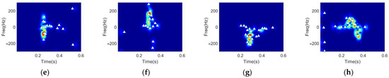 Demonstration of the feature vectors and the corresponding time-frequency distributions of the four hand gestures by DGS-SP: (a–d), and by OMP: (e–h), with K = 24.