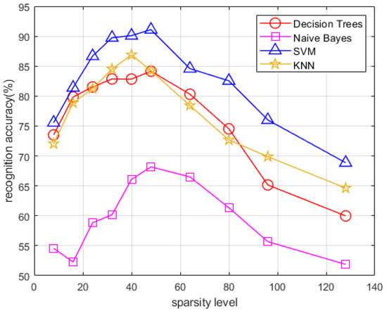 Next, we consider the recognition accuracy. Each record of dynamic hand gesture was processed using the proposed method for each sparsity level. By repeating the above process for all the collected data samples, a dataset of feature vectors of different dynamic hand gestures of different sparsity levels is constructed. Then, several traditional machine learning classifiers are separately employed for recognition, including the Decision Trees, Naïve Bayes Classifiers, support vector machine (SVM) and K-nearest neighbor (KNN). Eighty percent of the dataset is selected as the training set, and the rest is used as the testing set. One hundred Monte Carlo trials are performed to produce an average recognition accuracy for each sparsity level. The mean recognition accuracy for four types of hand gestures obtained using different classifiers under various sparsity levels are depicted in Figure 9.