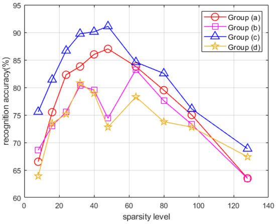 Then, quantitative comparison via evaluating the recognition accuracy by using 40% and 80% of the data as the training datasets are given in Figure 12. It can be found that the proposed method outperforms the OMP-based method when choosing the sparsity level larger than about 25, meaning that the proposed method is more robust with respect to the sparsity levels. The proposed method yields the highest recognition accuracy of 91.1% (mean value for the four gestures) when the sparsity level is set to be 48, while that value for OMP is 87.8% with the sparsity level set to be 8.
