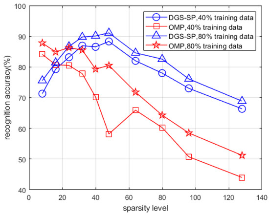 Recognition accuracy of the proposed method and the OMP method versus different sparsity levels.