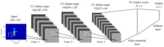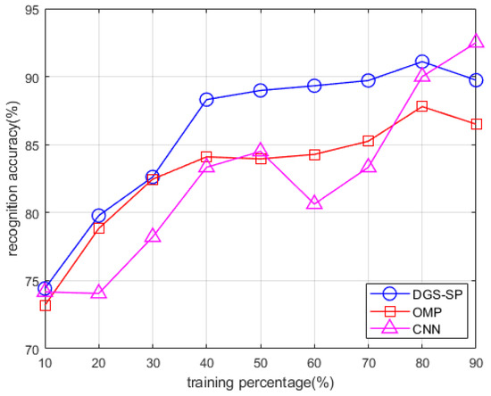 Finally, the recognition performance of the proposed method, OMP-based method and the convolutional neural network (CNN) method, another widely adopted approach [39] as illustrated in Figure 13, is analyzed with different sizes of training dataset. The size of the training data varies from 10% to 90% with a step of 10%. The sparsity level is set to be 48 for the proposed method, and the value for OMP is chosen as 8 (the best parameter for each one, as shown in Figure 12). The results are shown in Figure 14.