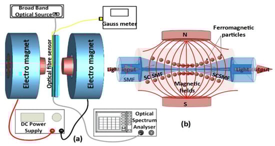 Optical fibre heterostructures and special fibre structures have also been demonstrated for magnetic field sensing using MFs. For example, single-mode–hollow core–single-mode (SHS) optical fibre immersed in MF demonstrated a sensitivity of −1.7 nm/mT []. However, due to an irregular spectral response vs. magnetic field variation, it only had a narrow measurement range. A spherical bulb structure on a single-mode fibre coated with MF [], a D-shaped fibre structure immersed in MF [], and a peanut-shaped structure cascaded with long-period grating [] have also been demonstrated for magnetic field sensing. However, these techniques have relatively low sensitivity.