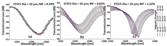Example of spectral response observed while increasing the magnetic field around a 10 μm waist diameter STSCS optical fibre magnetic field sensor, surrounded by MF with (a) 0.39%, (b) 0.81%, and (c) 1.22% FMPs.