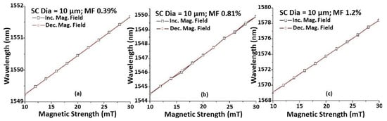 Figure 3 shows the wavelength shift versus magnetic field strength. As explained previously, the sensitivity to the magnetic field increases with increasing MF concentrations for the same taper waist diameter of the STSCS. Each reading was taken 2 min after the magnetic field was applied to the sensor to ensure that the spectral response had stabilised, which could reduce the hysteresis effect and allow the FMPs to release residual magnetisation. It can also be seen that the wavelength shift for a change in magnetic field strength remains nearly constant while increasing and decreasing the magnetic field strength, demonstrating that the proposed sensor has good reversibility.