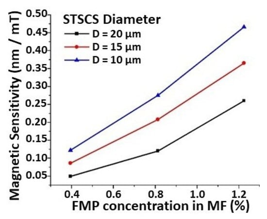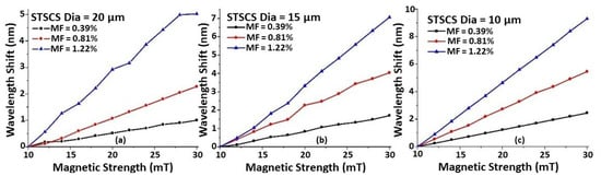 When the STSCS is surrounded by MF, the RI of the MF changes when an external magnetic field is applied, as explained above. An increase in the RI of the MF increases the and . However, the increases by a much larger value than does the []. Therefore, a shift towards a longer wavelength is observed in the interference spectrum [].
