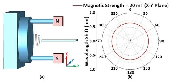 (a) The experimental setup used for measuring the angular magnetic field dependence in the X–Y plane, and (b) wavelength shift form λ0 when the rotation angle changes from 0° to 360° in the X–Y plane.