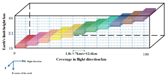 The UV Hyperspectral Detector is a limb viewing UV/visible spectrometer. The optical system of the spectrometer has three channels. The input beam undergoes two splits—first it is divided between the main science channel and the polarization measurement channel (PMC, channel 3 in Figure 2). The main science channel is then divided into two working spectral channels (channel 1 and channel 2 in Figure 2). The instrument works in the spectral range 290–500 nm, with a spectral resolution of 0.6 nm and a spatial resolution of 100 km × 3 km.The main detection target of the instrument is the spectral radiance of the 15–60 km limb atmosphere. The schematic diagram of limb scanning detection is shown in Figure 3. The main parameters of the instrument are shown in Table 2.