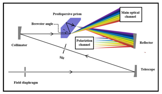 The main science channel and the polarization measurement channel (PMC) share the telescopic system, the entrance slit and the pre-dispersing prism. Passing through a pre-dispersing prism while simultaneously causing a portion of the beam to be incident on the PMC at Brewster’s angle produces an almost fully polarized beam with the polarization directed towards the paper (represented by the intersecting circles), that is, parallel to the instrument slit. After an internal reflection, it leaves the prism and is refracted into the polarization system. The optical structure of the PMC is shown in Figure 4.