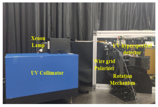 The wire grid polarizer was an Edmund ultra-wideband wire grid polarizer, its linear degree of polarization in the range of 290–500 nm is greater than 99%, The wire grid polarization characteristic curve is shown in Figure 6. and the incident angle is less than ±20°. The rotation table was the SOFN INSTRUMENTS CO. motorized rotation table with a precision of rotation angle higher than 0.01°. The experimental setup is shown in Figure 7.