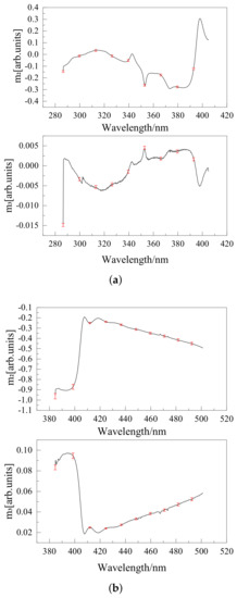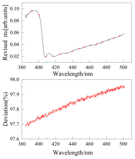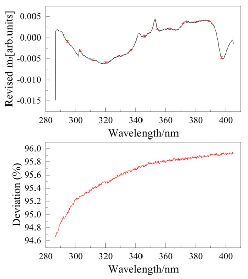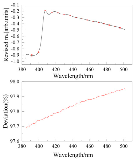 The wire grid polarizer extinction ratio is shown in Figure 16. Instruments were calibrated using the above method, and the results are shown in Figure 17, Figure 18, Figure 19 and Figure 20. The black curve revised the Mueller matrix elements as the wavelength function curve; the red curve is the pre-and post-corrected deviation of the Muller matrix elements with respect to the wavelength.