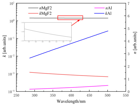 where is the reflectivity of the s-wave, is the reflectivity of the p-wave, is the transmittance of the s-wave, and is the transmittance of the p-wave. Air-MgF2 means the light wave passes through the air in MgF2; MgF2-Al means the light wave passes through the Al in MgF2. The complex refractive index is represented by , where n represents the refractive index and k represents the absorptivity. The absorptivity and refractive index of Al and MgF2 in the wavelength range of 290–500 nm are shown in Figure 11.